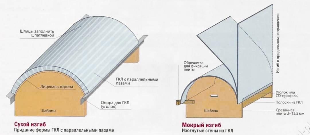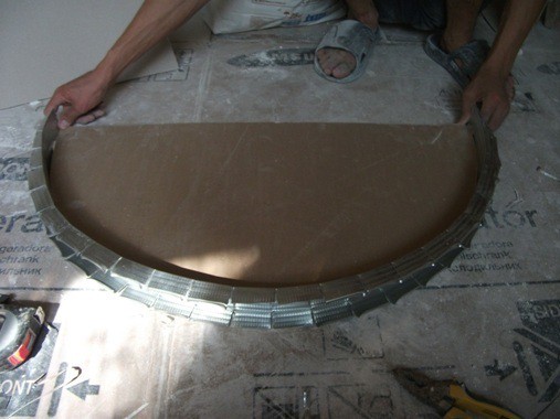 نجعل تثبيت الملف الشخصي على جانبي القوس ؛ - نرسم نصف القطر المطلوب على الحوائط الجافة ونقطعها. نعلق الورقة على الحائط مع ملف التعريف ونركب باستخدام المسامير ؛