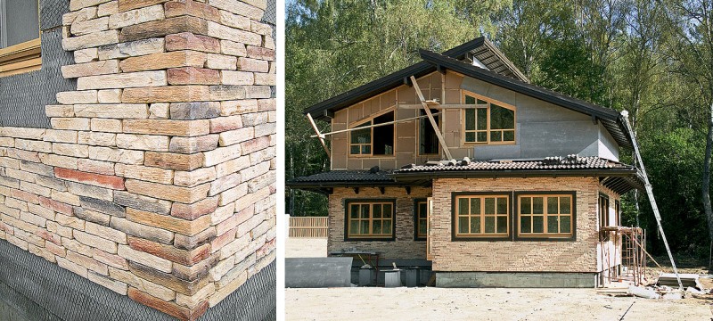 طبيعي ، يزن أكثر بكثير ودغات سعره. لذلك ، يتم تزيين المنزل في الخارج بالحجر الاصطناعي.