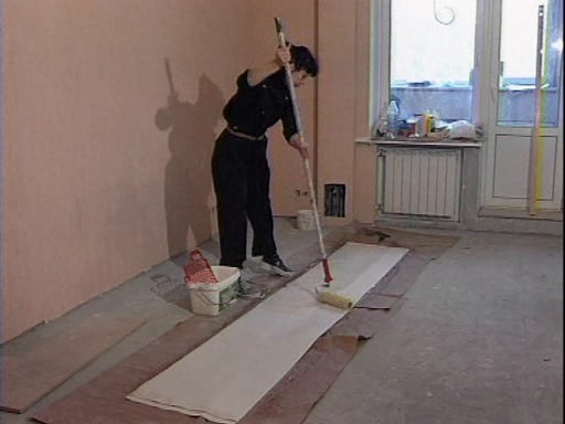 - في هذه المرحلة ، سيحتاج العمل إلى مساعدة شريك. يجب تطبيق اللوحة بعناية على المكان المحدد ، والبدء في السلاسة. يتم ذلك بشكل تقليدي من الأعلى إلى الأسفل ومن المركز إلى الحواف. يمكنك استخدام أسطوانة خاصة.