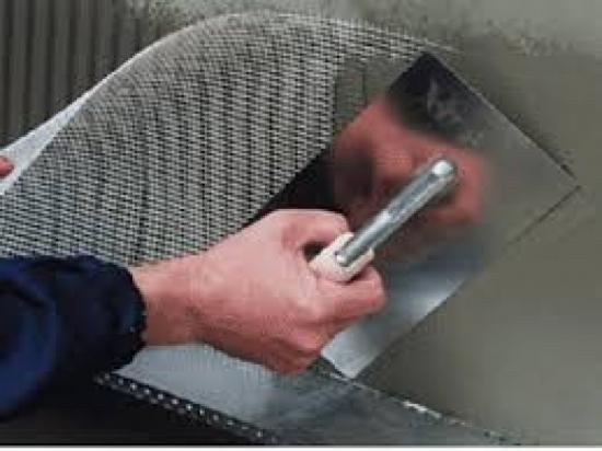 - يجب قطع شبكة التجصيص ، التي تباع غالبًا على شكل لفائف ، إلى قطع منفصلة ، لا يزيد طولها عن متر. قم بتثبيت القطع الفردية ، لأن الخليط العالمي يجف بسرعة كافية ؛