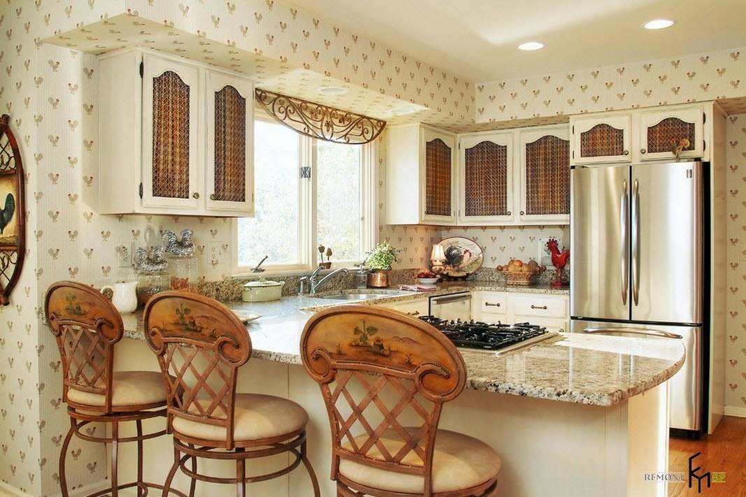 دعونا نلقي نظرة على الأمثلة الأكثر صلة لتزيين الجدران في المطبخ باستخدام ورق الحائط: