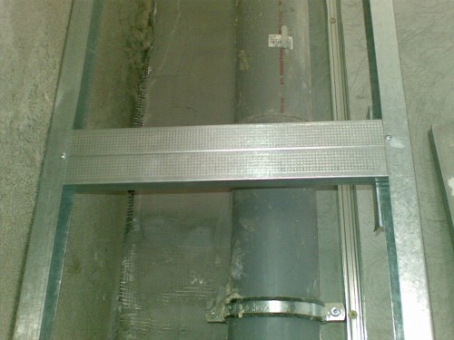 بنجاح خاص يمكنك إخفاء المجاري وأنابيب المياه ، لأنها عادة ما تمر في منافذ. هنا يمكنك حتى الاستغناء عن إطار معدني ، يتم ثمل الصفائح بشكل مثالي على المسامير ، مدفوعة في مقدمة الجدار. وإذا قمت بتثبيت أقلام صغيرة على الأوراق ، فيمكنك جعل ألواح الحوائط الجافة قابلة للإزالة للتحكم في حالة الأنابيب.