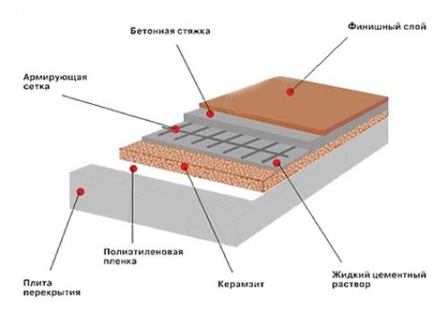 - Un treillis d'armature est posé sur la couche d'argile expansée, qui est coulée avec du mortier de ciment liquide. Il se révèle un design scellé.