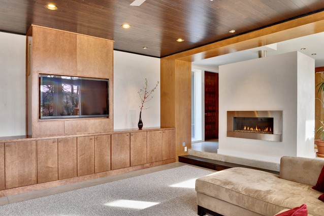 - Изкуство. Телевизорът е перфектно балансиран от камина, разположена в ниша. В този случай скритите шкафчета могат да бъдат поставени в стената.