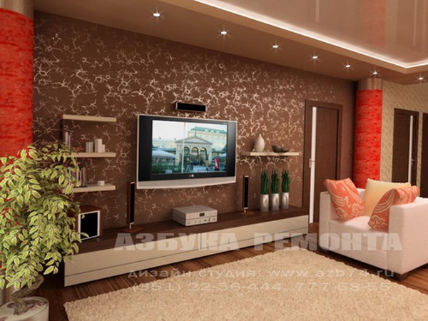 - Характеристиките на оформлението на стаята се вземат предвид, Много често в проектите телевизорът е централен елемент, спрямо който са поставени останалите интериорни елементи.