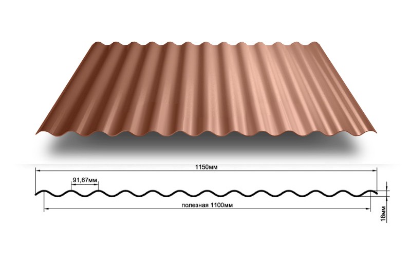 | MP18 (V) | Този тип се отнася до универсални опции, има характеристики с висока производителност.Произвежда се както от поцинкована стомана, така и от тънки листове с боя и лаково покритие, Дебелината на листа варира между 0,5-0,8 мм. Ширината е стандартна, 1150 мм. Високата здравина се осигурява от синусоидалната форма на релефа, с височина на гофриране 18 мм. Предлага се в широка гама от цветове, с полиестерно покритие. На снимката в началото на статията прекрасен пример фасадна облицовка професионална настилка MP18. | |