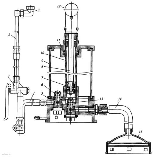 - Върху налягащата втулка 4 от резервоара съставът се подава към въдицата 2, върху която е монтиран надземен кран 1.