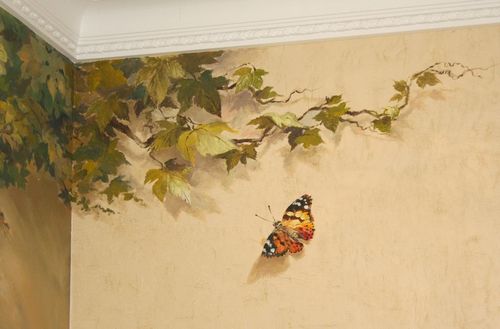 - Основните контури са обозначени с въглен или сепия, а силуетите на чертежа са изчертани. В този случай е необходимо стриктно да се спазват пропорциите и да се поддържа хармония, като се използва правилото "измерете седем пъти, изрежете едно". Не можете да бързате, трябва постоянно да сравнявате и контролирате резултата, когато прехвърляте картината от скицата към равнината на стената.