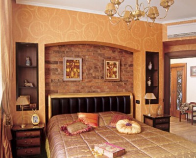 - Спалнята е декорирана в провинциален френски стил или в селски селски стил (вижКак да проектираме стени в кънтри стил), едноцветен тапет или платно за имитация на тухли ще изглежда страхотно.