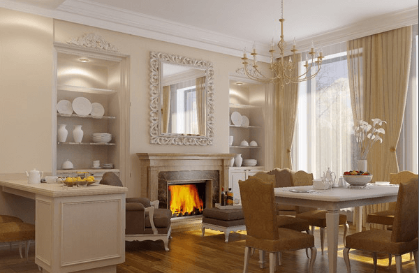 - Класическите стилове са подходящи за изображения на класически камини, украсени с дърво, тухла или камък. Заобиколен от завеси, колони или рафтове за книги.