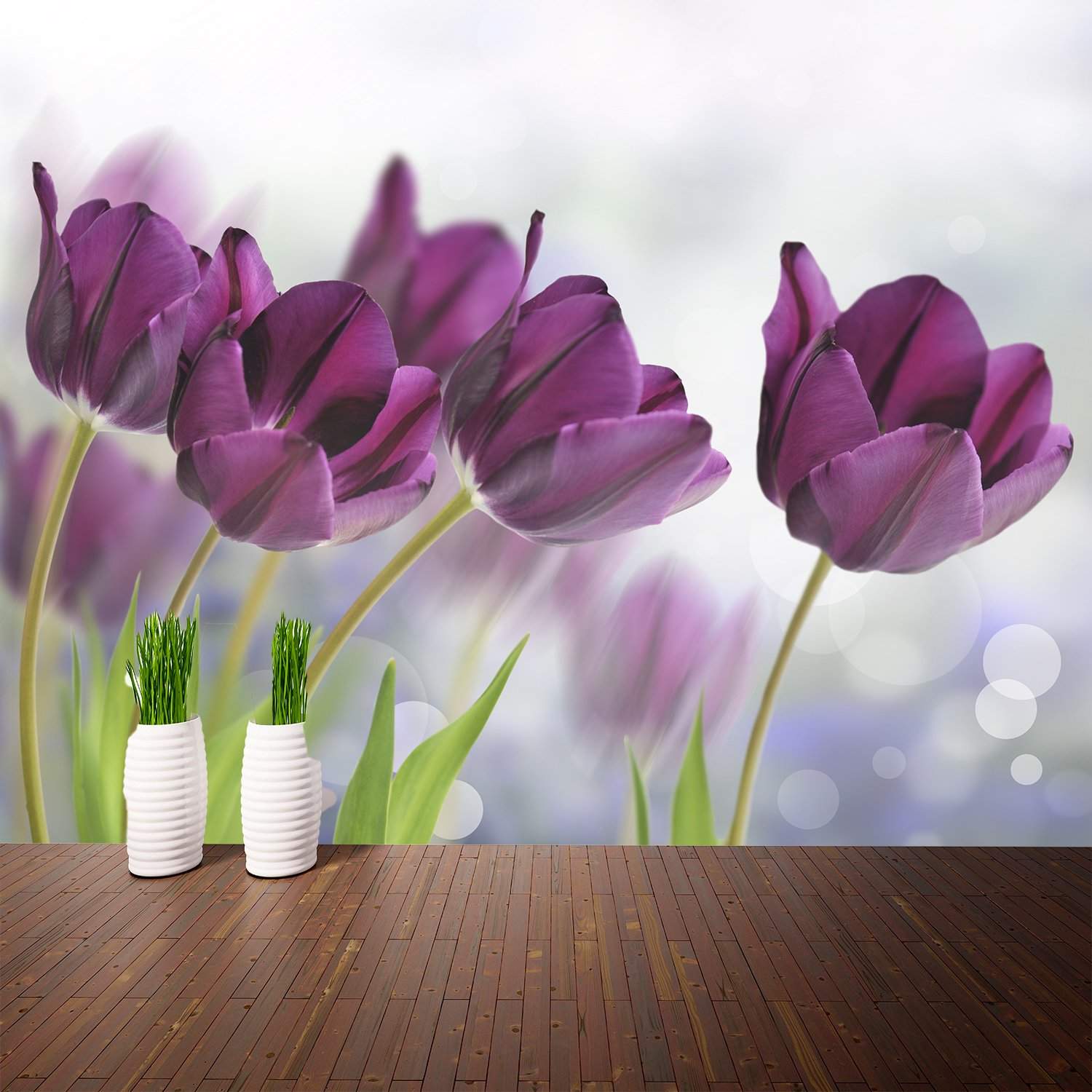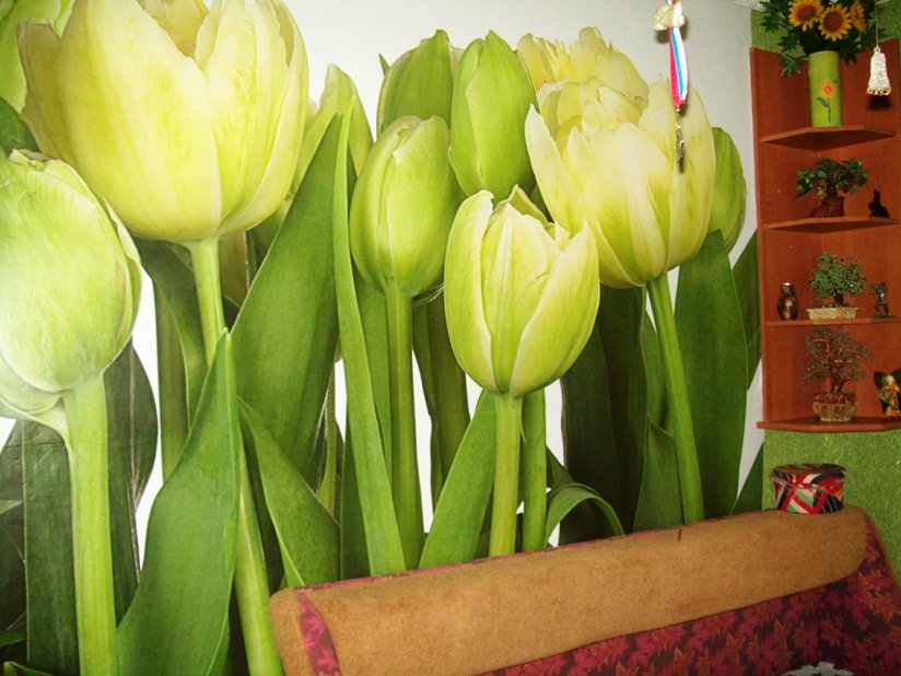 Стените стенописи зелени лалета трябва да се използват в случаите, когато е необходимо да се създаде мека и удобна атмосфера. Но проблемът е, че в природата зелените лалета са само в ранните етапи на цъфтеж. В този случай белите лалета, както на снимката по-горе, ще бъдат идеална опция.