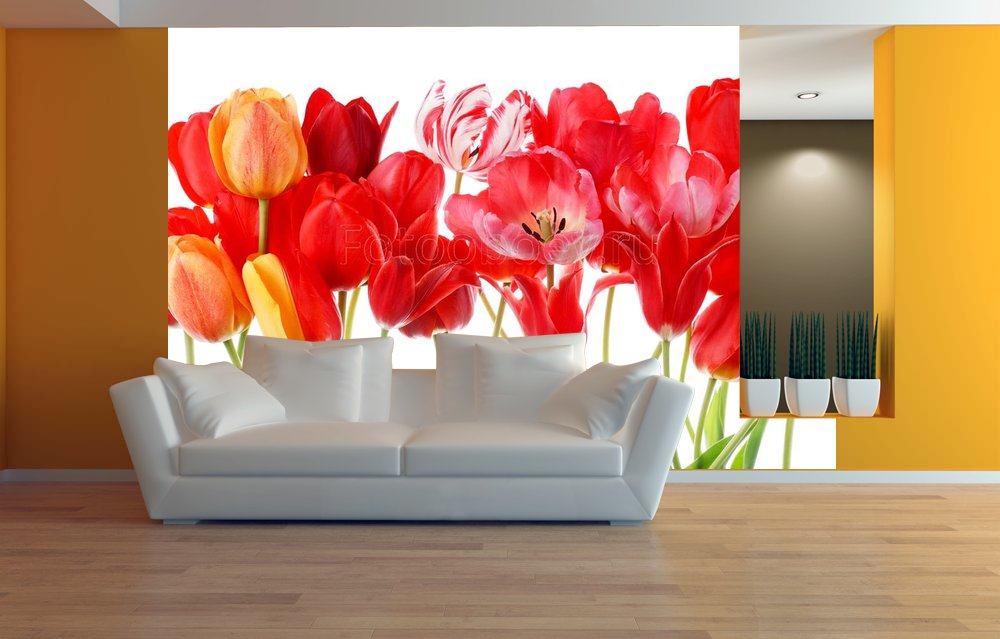 Червените лалета с право се считат за най-често срещаните и популярни, именно с тях се свързва легендата за появата на това цвете. Символ на любов и преданост, това е техният обичай да дават жени на 8 март. Стенописите и лалетата с червени или бордо нюанси също са уместни.
