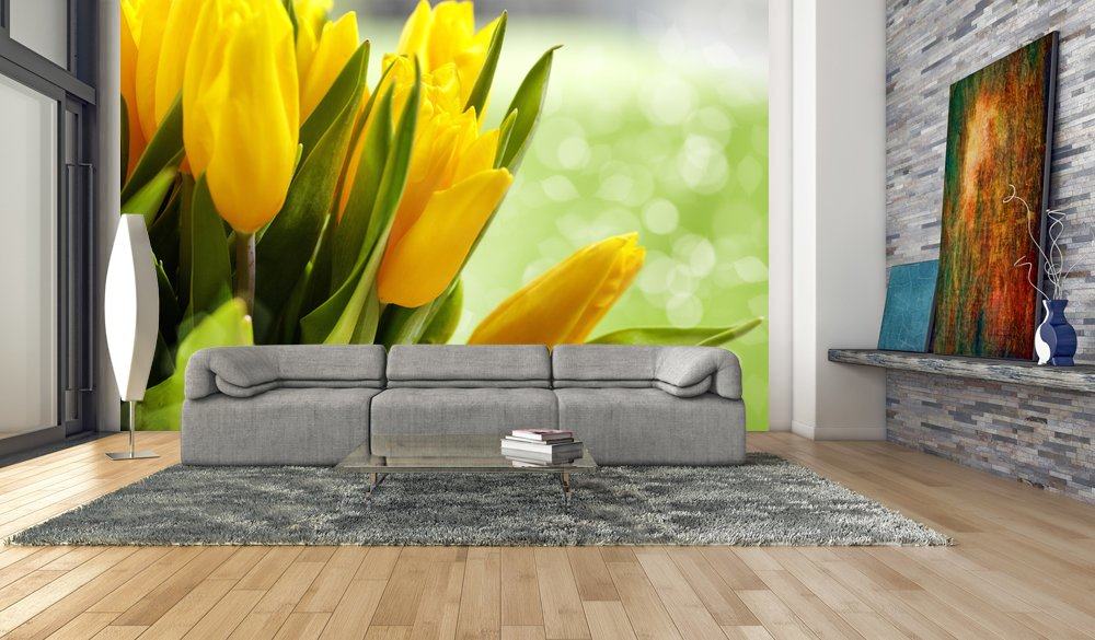 Ако говорим за лалета с фототапета на стена, тогава жълтият цвят е един от най-атрактивните за всеки интериор. Цветята с ярки, слънчеви нюанси са неразделна част от стилове като Прованс или страна.