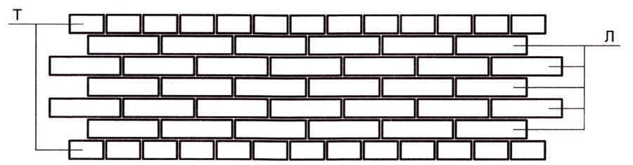 - редуване на редове с пъпки и лъжици с ширината на стената;