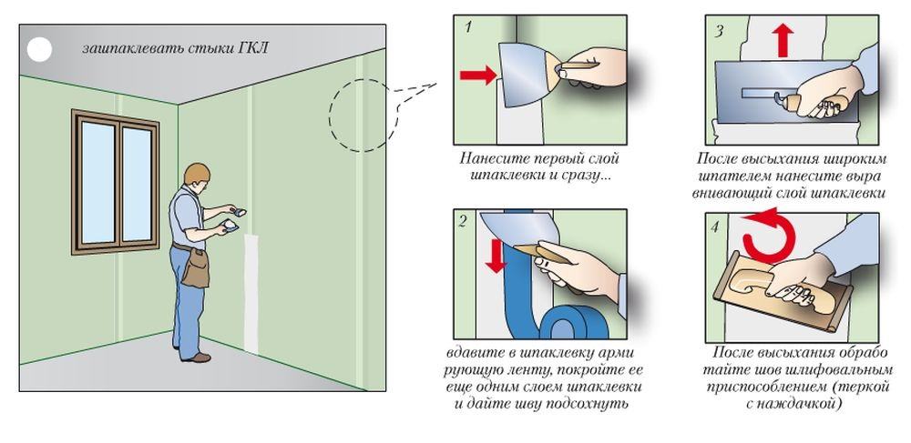 - Допълнителна декорация на стени от гипсокартон се прави подобно във всички случаи. Свързвания между чаршафи, самонарезни глави, дупки - всичко това трябва да се шпаклова (виж Как да се сложи качество на гипсокартон) Как става това е показано на снимката по-горе.