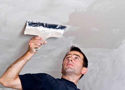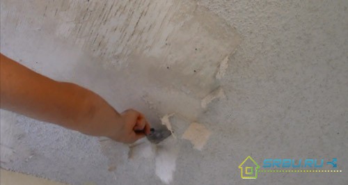 - докоснете дръжката на шпатулата по цялата повърхност на тавана. Там, където се чува тъп звук, замазката трябва да се отдели с шпатула - започна да се ексфолира от тавана.