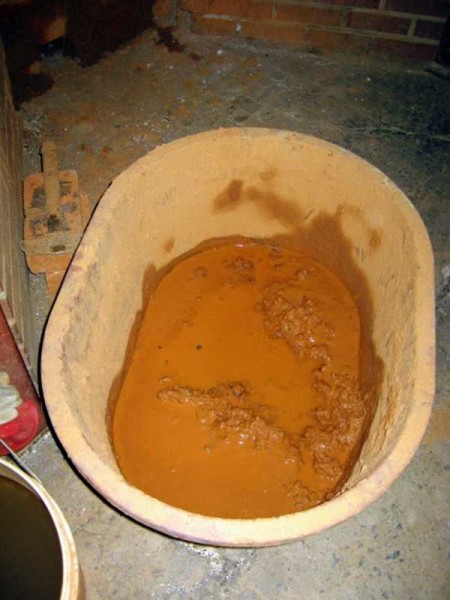 - Разреждаме глината в отделна кофа до течно състояние и нанасяме сместа върху повърхността с гъста четка. Това ще намокри фурната под основния слой и ще създаде допълнителна адхезия към мазилката.