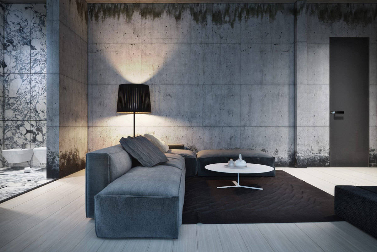 Стилизацията на антични стени може да се извърши не само като имитация на стара напукана мазилка. Това може да бъде съвременният декоративно-бетонен декор, който се изпълнява не само върху бетон, но и върху всеки друг - дори дървен, фундамент.
