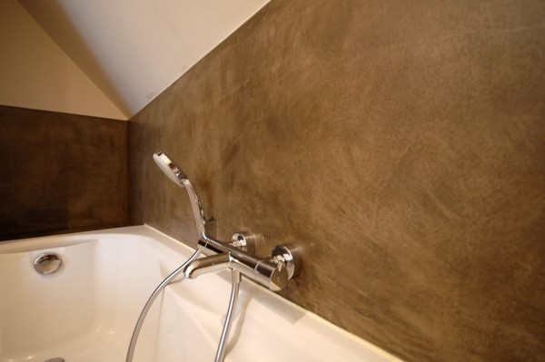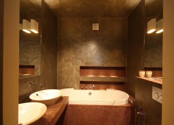 - Също така за довършителни бани могат да се използват Венецианска мазилка декоративна устойчивост на влага. Но е желателно да го покриете със защитен слой, който често се използва като специален восъчен оптимист за измазани повърхности, създавайки защитен устойчив на влага филм.