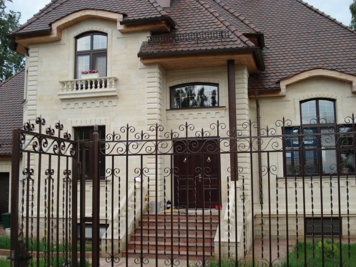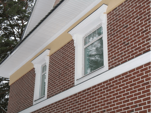 - Що се отнася до зоните на прозорците и самите прозорци, има още повече опции: полиуретанова или пластмасова облицовка, ъгли, решетки от ковано желязо и красиви щори. Ако къщата има балкон или тераса, тогава фасадата ще бъде украсена с оригинален парапет.