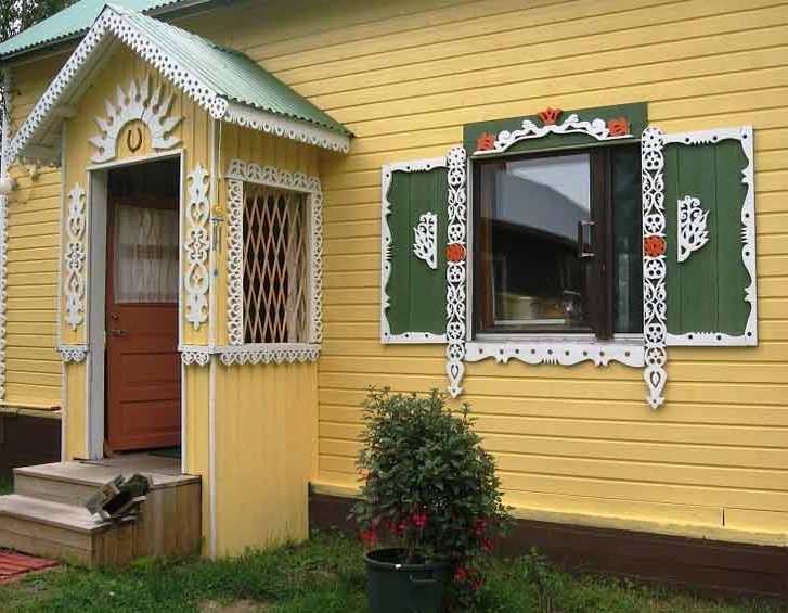 И основната украса на такава фасада могат да бъдат издълбани корнизи и дограми, оригинални капаци и веранда.