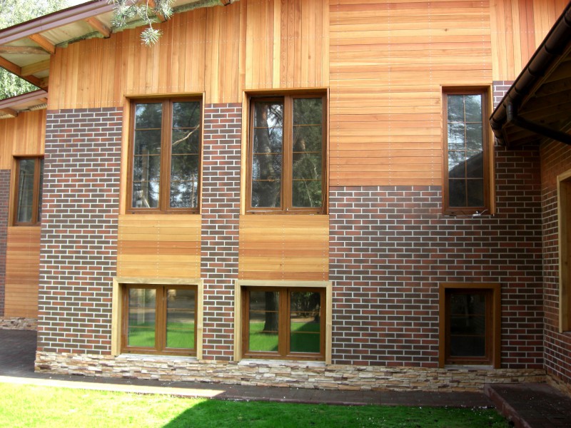 И накрая, нека поговорим малко за това как да използваме дърво в външната декорация на къщата. Най-често за това се използва облицовъчна дъска.