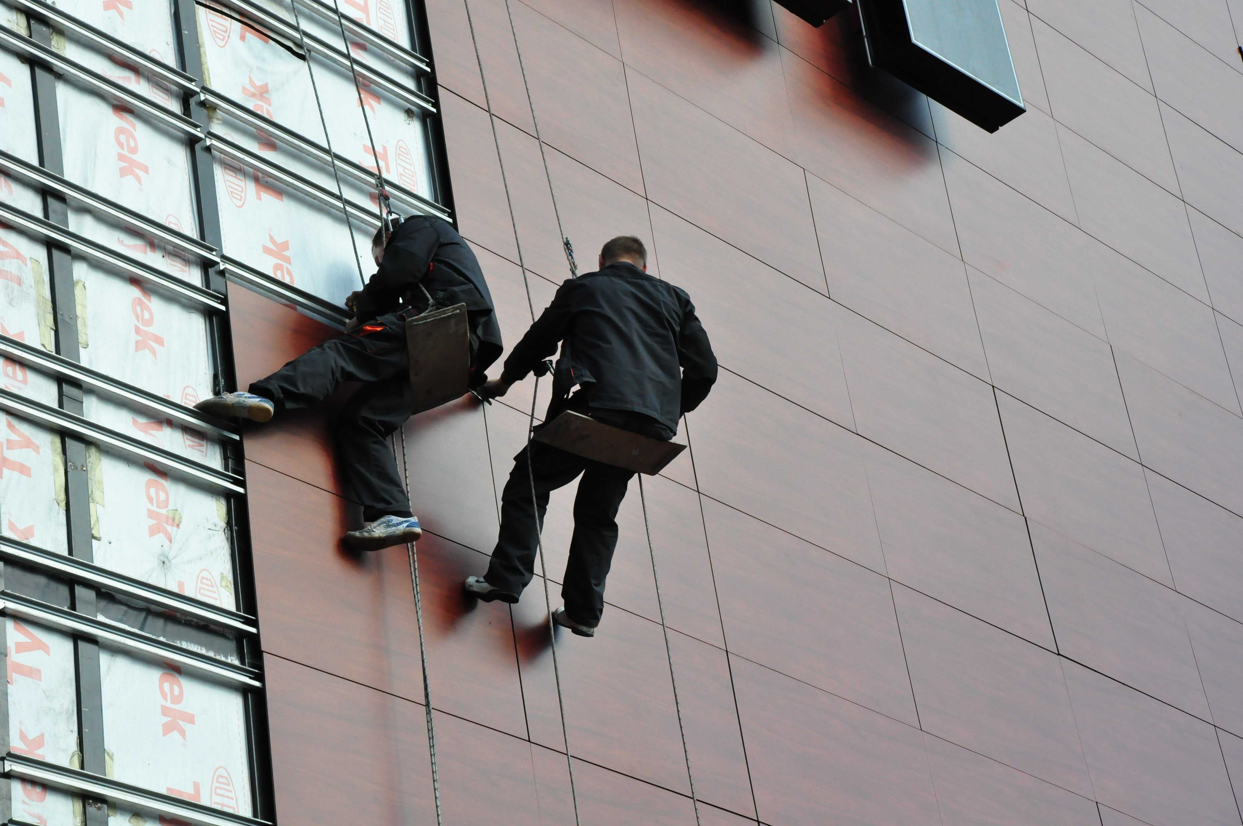 - Като се има предвид, че композитните панели се използват по-често за облицовки на обществени и административни сгради, чиито фасади са големи, преди започване на работа те се разделят на вертикални захващания, с площ около 4 м2. Обикновено екип от инсталатори, които се движат последователно по ръкохватките, всеки от които извършва свои собствени технологични операции.