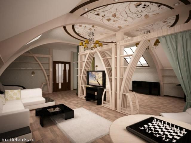 Comme nous l'avons déjà dit, dans l'espace du grenier il n'y a rien qui puisse interférer avec la mise en œuvre de toute conception: cloisons, colonnes, arcs, plafonds suspendus. L'essentiel est d'être spacieux.