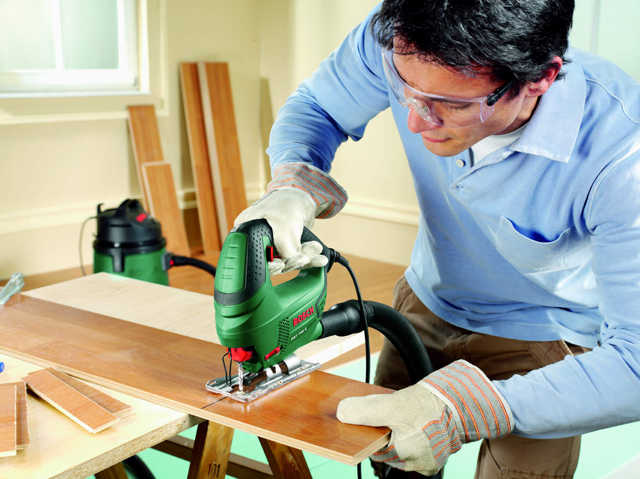 - Sie schneiden das Laminat mit einer elektrischen Stichsäge und tun dies schräg, um die dekorative Schicht nicht zu stören. Kleine Abfälle werden nicht weggeworfen, sondern in kleine Streifen geschnitten, die dann als temporäre Montageabstandshalter installiert werden.