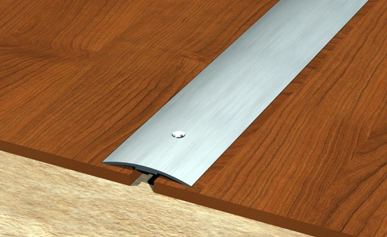 - Um die Häcksler und entlang der horizontalen Kontur des Rahmens liegt ein Streifen Montageschaum. Wenn die Breite der Neigung die Breite der Laminatplatte überschreitet, werden sie an der Schwelle mit Hilfe eines solchen Profils verbunden, das in der Abbildung dargestellt ist. Bis der Schaum gefroren ist, wird der Schwellenteil installiert, mit etwas Schwerem zerkleinert, und zum Schließen des vorderen Endes des Laminats wird eine Aluminiummutter geschraubt.