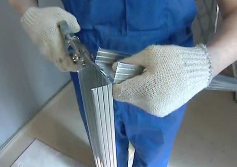 - Die Ecke wird wie folgt ausgeführt. Das Profil der gewünschten Länge wird geschnitten, in einem Winkel von 90 Grad gebogen und beidseitig durch die Kerbe fixiert.