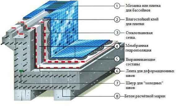 Die Auskleidung der Poolschalen erfolgt unmittelbar innerhalb der Struktur und erst dann gehen alle Arbeiten an die Wände.Dies ist nur möglich, wenn Keramikfliesen gleicher Größe ausgewählt sind.