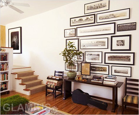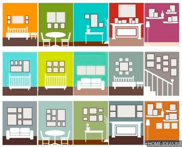 - Bilder in Gruppen zu bilden, die näher an den Möbeln liegen und gegenseitige Harmonie oder Quadrat schaffen;