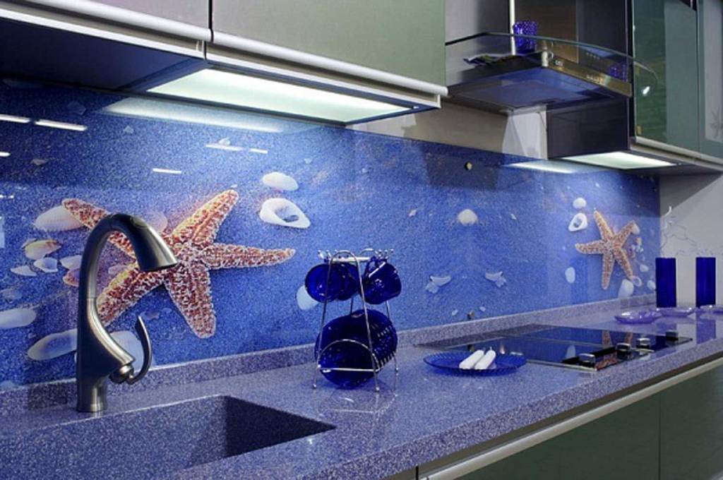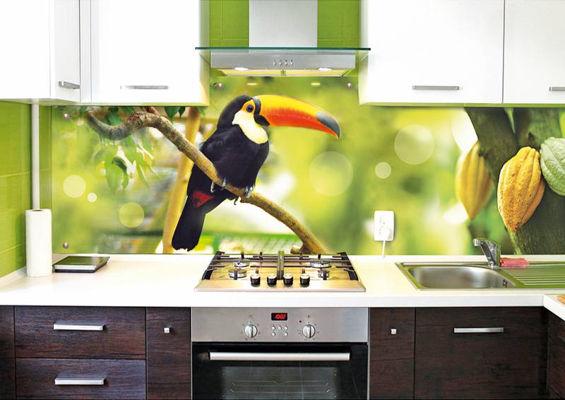 - Ein vergrößertes interessantes Muster unter Glas hilft Ihnen, die Küche zu diversifizieren.