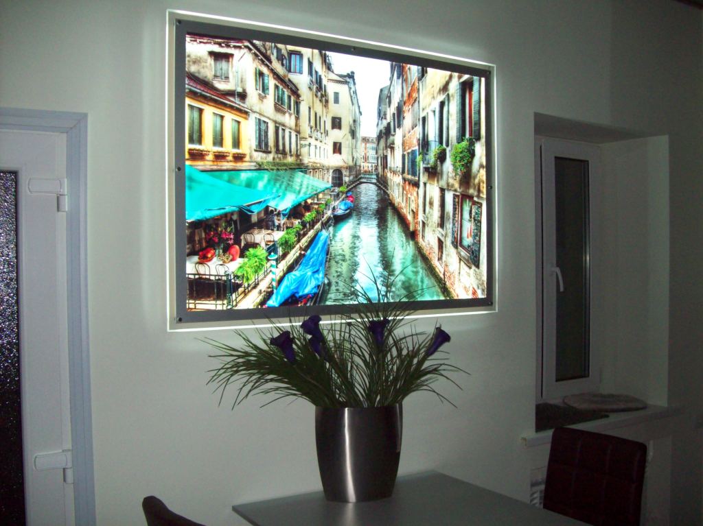 - Auf Spezialkleber. Es wird in dünnen Streifen auf die Oberfläche aufgetragen, wonach die Platte einige Minuten lang gegen die Wand gedrückt werden muss. Der Nachteil dieser Methode ist, dass es unter einem solchen Bild unmöglich ist, eine Hintergrundbeleuchtung zu platzieren, daher muss das Band um den Umfang geklebt werden oder sich sogar weigern, es zu verwenden.