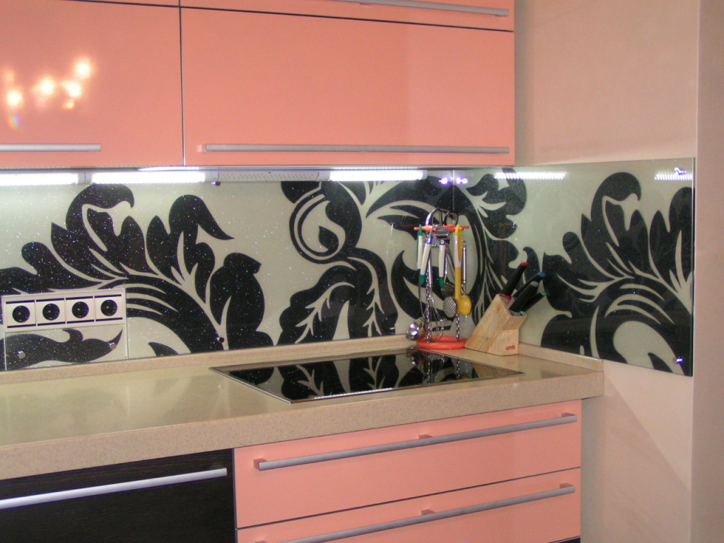 - Wir sehen ein Beispiel einer Küchenschürze aus Glas, die mit ihrem Muster den Stil der Küche betont