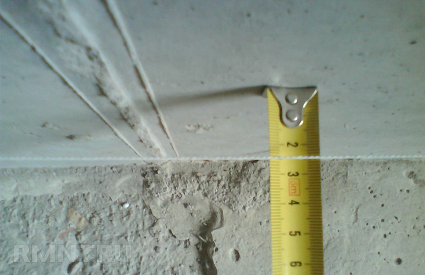 - Danach können Sie überprüfen, wie gleichmäßig der Primer aufgetragen wird. Nehmen Sie dazu eine flache Schiene oder Regel und tragen Sie sie in verschiedenen Richtungen auf die Decke auf. Bei Feststellung schwerwiegender Unterschiede werden diese mit einer Lösung beseitigt. Dies muss erfolgen, wenn der Primer noch nicht ausgehärtet ist.