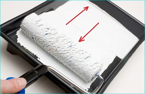 Der Hauptbereich wird mit einer Walze gestrichen, in die in das Bad gegossene Farbe getaucht und der Überschuss durch Rollen auf einer gerippten Oberfläche herausgedrückt.