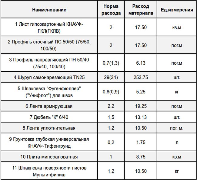 Zur Berechnung der ungefähren Materialmenge wird eine Tabelle dargestellt, in der die Verbrauchsraten der für die Installation der Wand erforderlichen Materialien angegeben sind, deren Abmessungen: