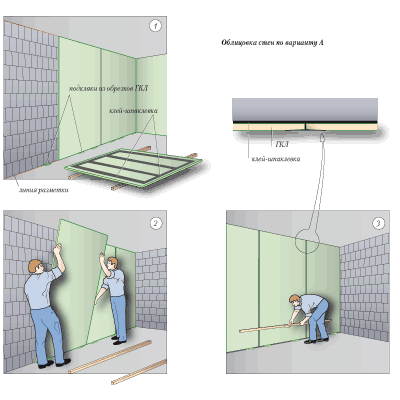 Rahmenlos Gipskartonwandverkleidung ziemlich schnell durchgeführt. Alle Parameter des Raumes werden vorab gemessen, und auf ihrer Grundlage wird das Material geschnitten.