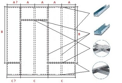 - Als nächstes müssen Sie die Raumaufteilung vornehmen und die Position der Haupt- und Nebenprofile bestimmen. Dazu benötigen Sie ein Maßband und einen Bleistift.