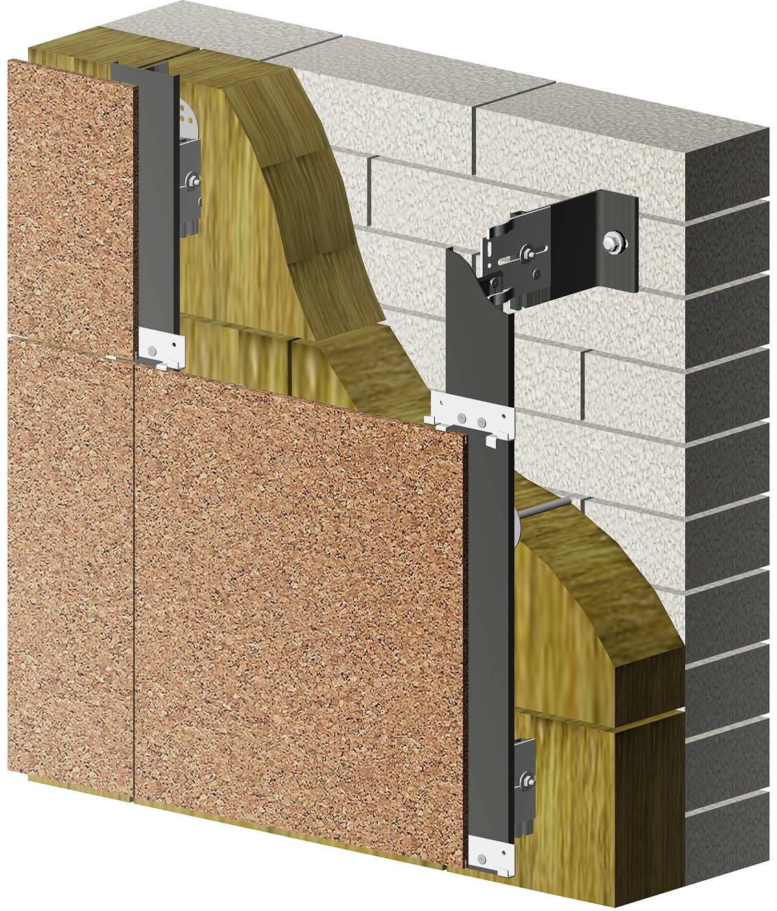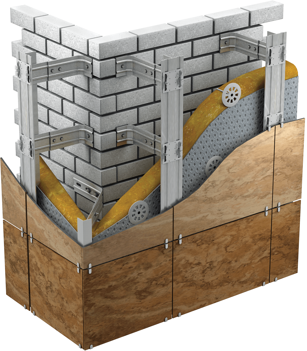 Dieses System für keramische Granitverkleidungen wird verwendet, wenn das Gewicht und die Größe des Materials groß sind. Ein weiterer Vorteil sind Lüftungslücken im Endbearbeitungsprozess, die zu einem guten Luftaustausch der Struktur beitragen.