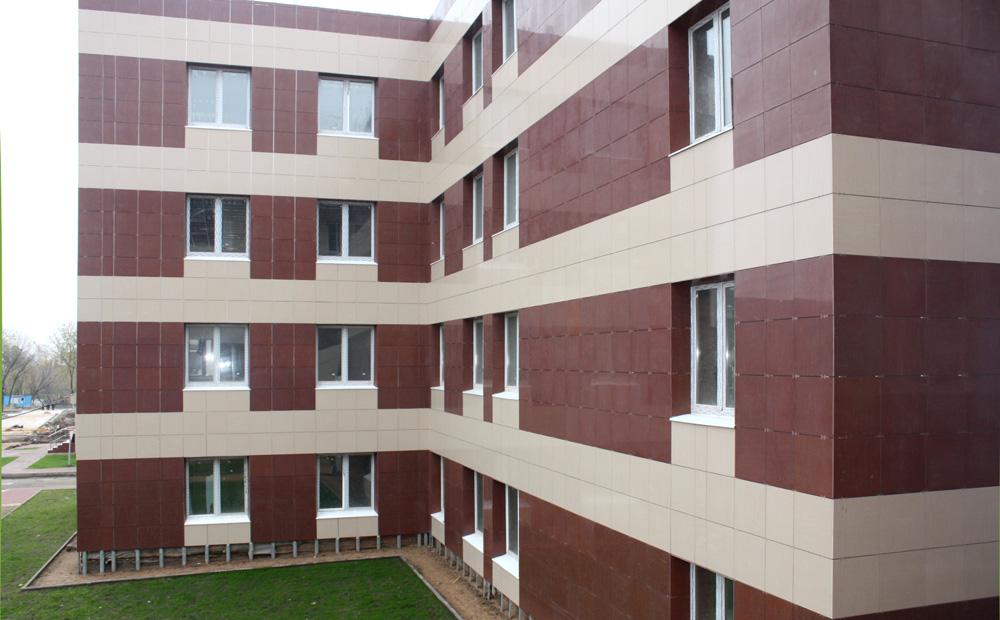 Wenn gewöhnliche Porzellanfliesen auf die Klebelösung montiert werden, dann auf die Metallrahmenfassade.