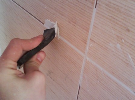- Nach dem Verlegen der Reihe müssen Sie mit dem Winkel eines Spatels entlang der Naht gehen und den Kleber entfernen.
