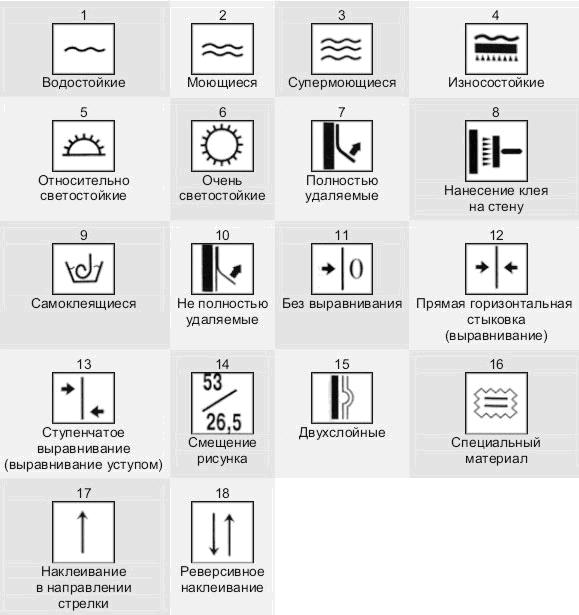 - Jeder Tapetentyp hat viele andere Eigenschaften, die auf dem Symbol auf dem Etikett zu finden sind. Die Symbole zeigen auch an, wie die Tapete richtig geklebt, mit der Zeichnung verbunden und von den Wänden entfernt wird.