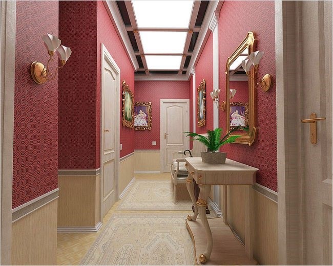 - Helle, kühle Tapetentöne eignen sich perfekt für beengte Flure.. Es kann Blau, Lavendel, Hellgrau, Blau und Hellpurpur sein. Sie können den Raumbereich optisch vergrößern.