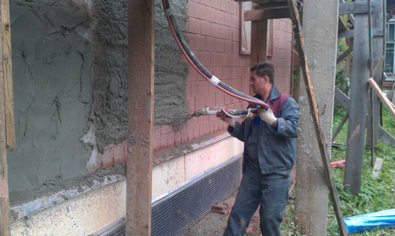 Es kann sich um ein Druckluftwerkzeug handeln, das Sie auf dem Foto sehen, einen doppelseitigen Hammer mit einer gezackten Oberfläche oder eine entsprechende Düse an einem Perforator. Kerben sind für eine gute Haftung des Sprays auf der Grundfläche unerlässlich. Die Vorbereitungsarbeiten umfassen auch den Prozess der Wandpolsterung mit Verstärkungsgitter oder Schindeln sowie die Installation von Leuchtfeuern.