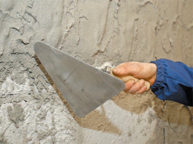 - Die Basisschicht wird durch Aufsprühen der Mischung auf die bearbeitete Ebene unter Verwendung des äußersten Teils der Kelle aufgetragen. Dieser Vorgang ist auch für Stuckateuranfänger nicht schwierig. Die Mischung wird nach dem Auftragen auf die Wandebene nicht eingeebnet. In der Regel werfen sie es auch mit Hilfe von Hilfsmitteln wie einem halben Trick oder einem Falken (siehe Wandputzwerkzeug: Was Sie zum Arbeiten brauchen) Die Mischung beim Bewegen des Falken wird an der Wand verschmiert.