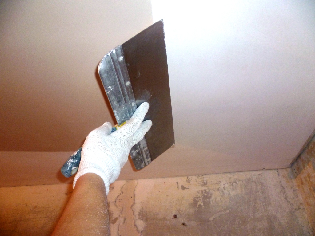 Kitt wird mit einem schmalen Spatel auf einen breiten Spachtel aufgetragen und mit Gleitbewegungen auf die Wand oder Decke aufgetragen. Wenn Sie mehrere Schichten auftragen, wird jede parallel zur vorherigen überlagert. Es ist besser, das hellste Licht in einem schrägen Winkel auf die Arbeitsfläche zu spachteln: Auf diese Weise unterstreichen die Schatten alle Unregelmäßigkeiten.