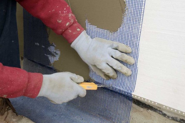 Wir fahren direkt mit dem Verputzen von Polystyrol fort. Zunächst wird an seiner Oberfläche ein Verstärkungsnetz angebracht, das in der folgenden Reihenfolge auf den Klebstoff oder die universelle Zusammensetzung geklebt wird: